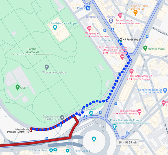 For those staying at the HF Fénix hotels (located in Marquês de Pombal, Lisbon), the easiest and direct route to reach FCT NOVA is by using a taxi or a ride-sharing service app such as Uber or Bolt (15 to 25 min).